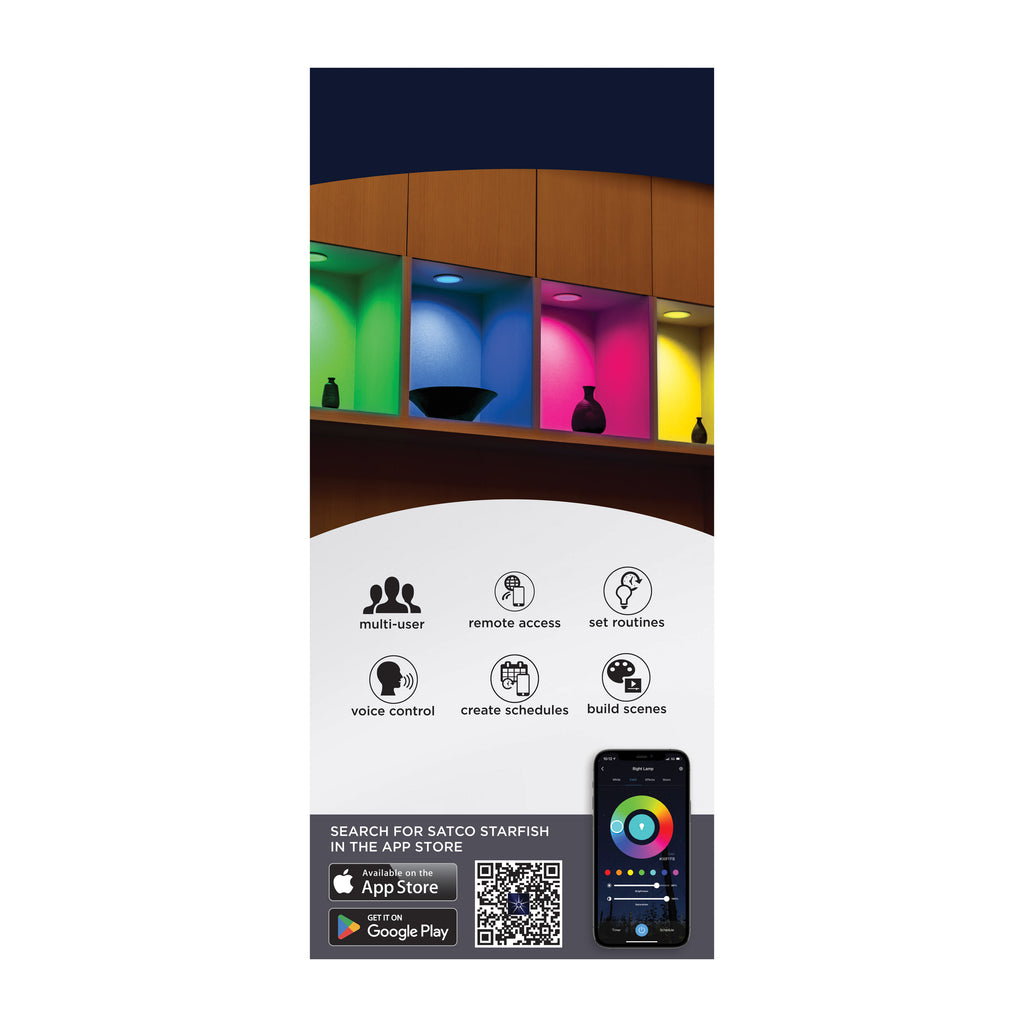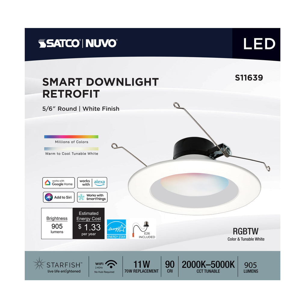 SATCO NUVO'S S11639 LED Retrofit Downlights with STARFISH technology are the ultimate choice for smart lighting and ambiance control. Download the STARFISH app to customize any tunable white color temperatures from 2000K warm white light to 5000K natural light, or choose from millions of colors on the RGB spectrum, all from your mobile device.